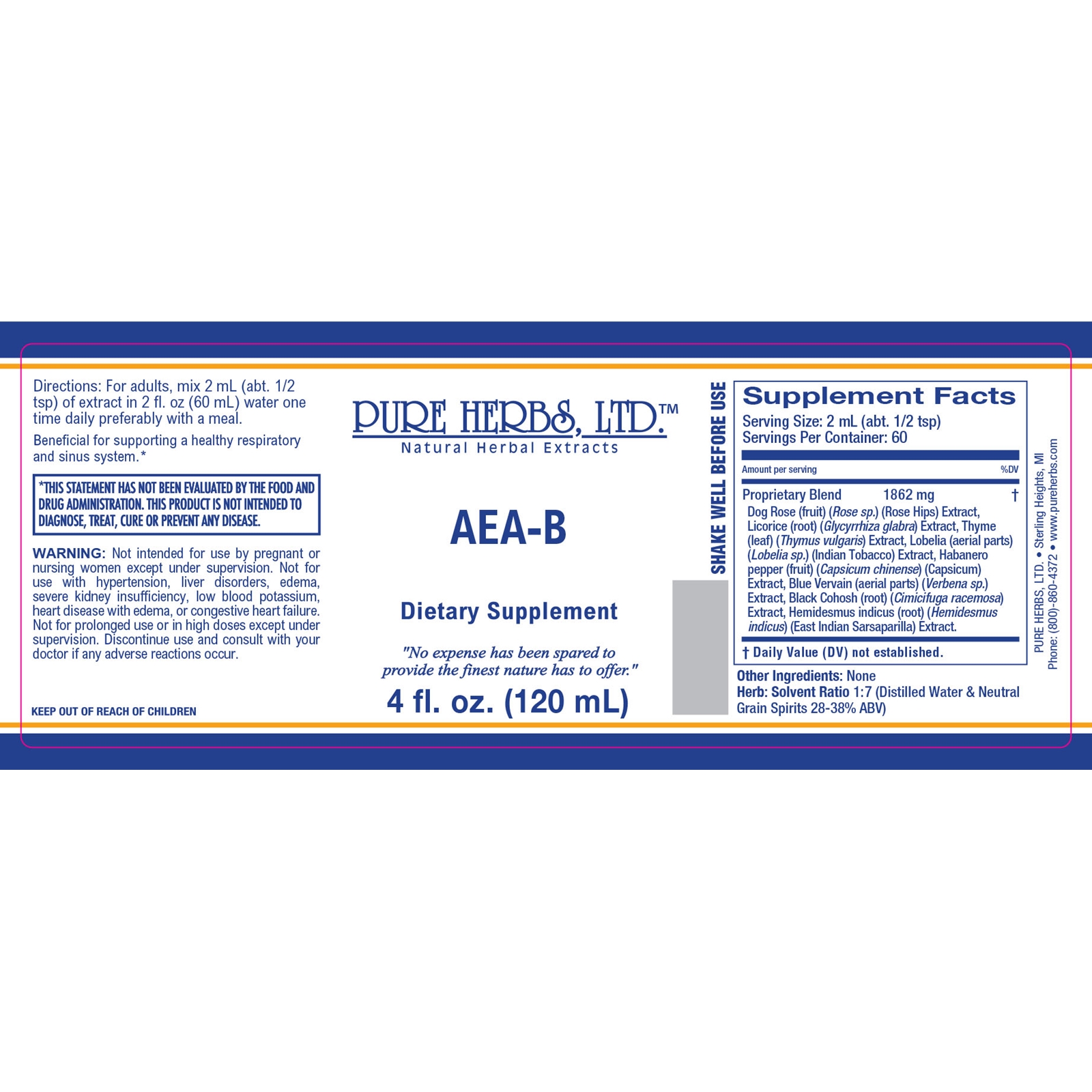 AEA-B - Asthma, emphysema, Allergies by Dr. Bill Horosh, sinus, upper respiratory congestion. - (Herbal Adjustment [Black Cohosh, Blue Vervain, Capsicum, Indian Sarsaparilla, Indian Tobacco], Wild Rose Hips, Licorice Root, Thyme) Beneficial support for a healthy respiratory and sinus system.*. aeab
